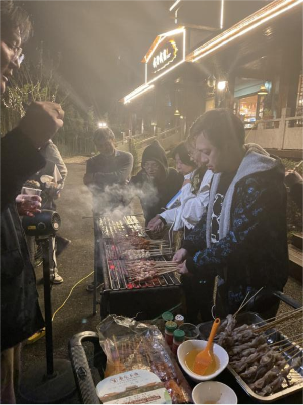 美景與美食,都是旅途當中不可缺少的元素。在此次行程中,令人最印象深刻的就是晚上的那一場自助燒烤了。我們印象中的燒烤就是廚師用著熟練的燒烤手勢,刷油,翻肉、撒孜然,最后問你要不要辣。但是到了我們自己手中,卻截然不同,我們生火燒炭就足足少了半個多小時。當然除了生火,困難一個接著一個,比如大家在烤肉的時候被煙熏火燎,小伙伴們想到用電扇反方向吸煙吸熱,讓大家燒烤環境更好;再有就是在烤肉的過程中肉很快會烤焦,小伙伴就把烤爐分成3個區域,生的直接烤制,快熟的放錫紙上,已經熟了的只放錫紙下面不放煤炭。烤的像模像樣,鮮美可口。