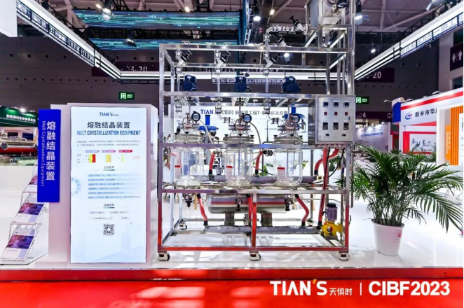 合而共贏,方能健步前行。在本次展會中,天俱時集團展位還展出了戰(zhàn)略合作伙伴重慶敏恒科技有限公司所帶來的熔融結(jié)晶裝置與分子蒸餾裝置。其中,熔融結(jié)晶裝置相較于傳統(tǒng)列管結(jié)晶可節(jié)省占地面積與投資成本,提升效率,并且產(chǎn)品純度最高可達99.9999%,廣泛應(yīng)用于VC/FEC等添加劑領(lǐng)域。分子蒸餾裝置可使液體在遠低于沸點的溫度下分離,并且受熱時間短,分離程度高,可做到連續(xù)流,特別適用于熱敏性物質(zhì)的蒸餾提純。